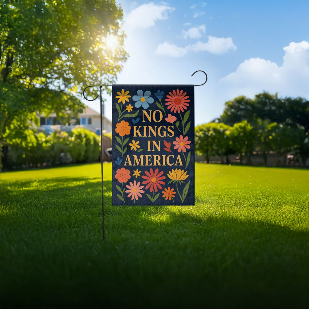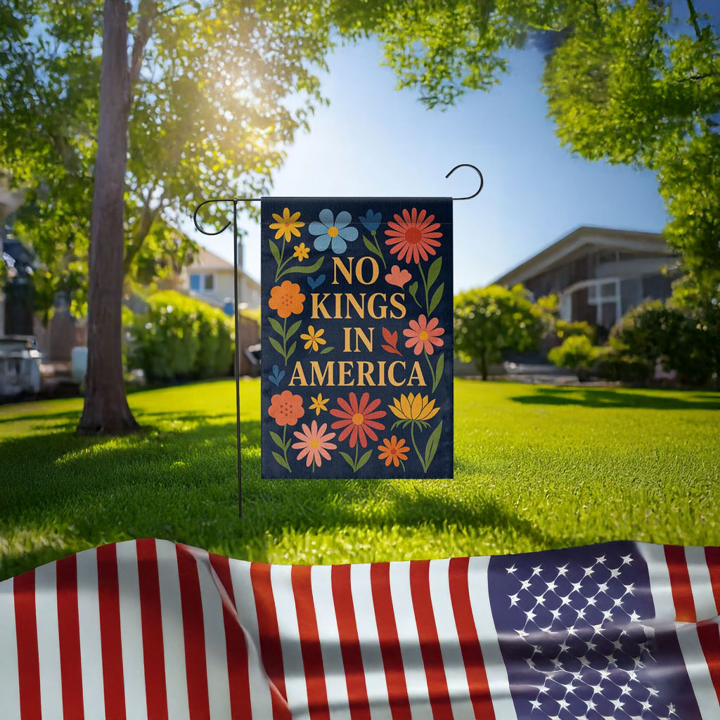 No Kings in America Garden Flag – Bold Patriotic Floral Yard Flag – Peaceful Protest Design