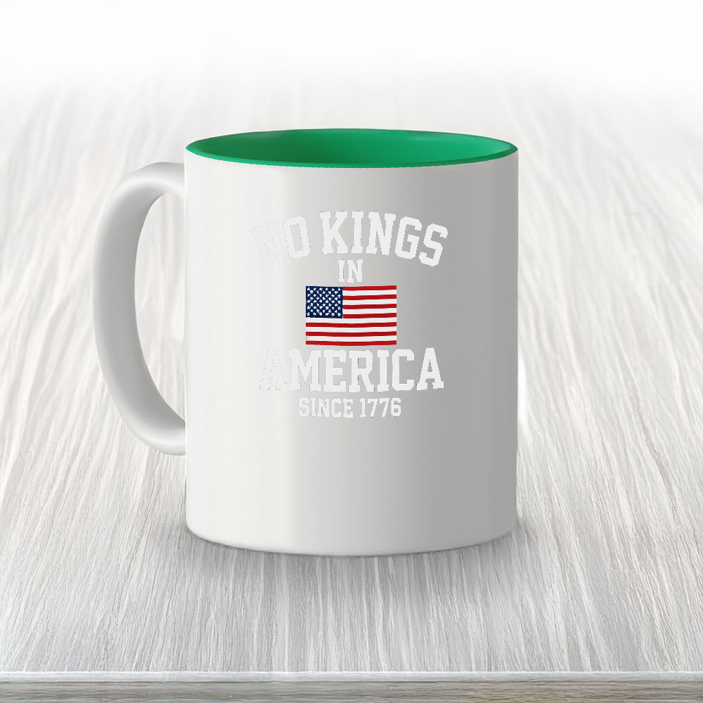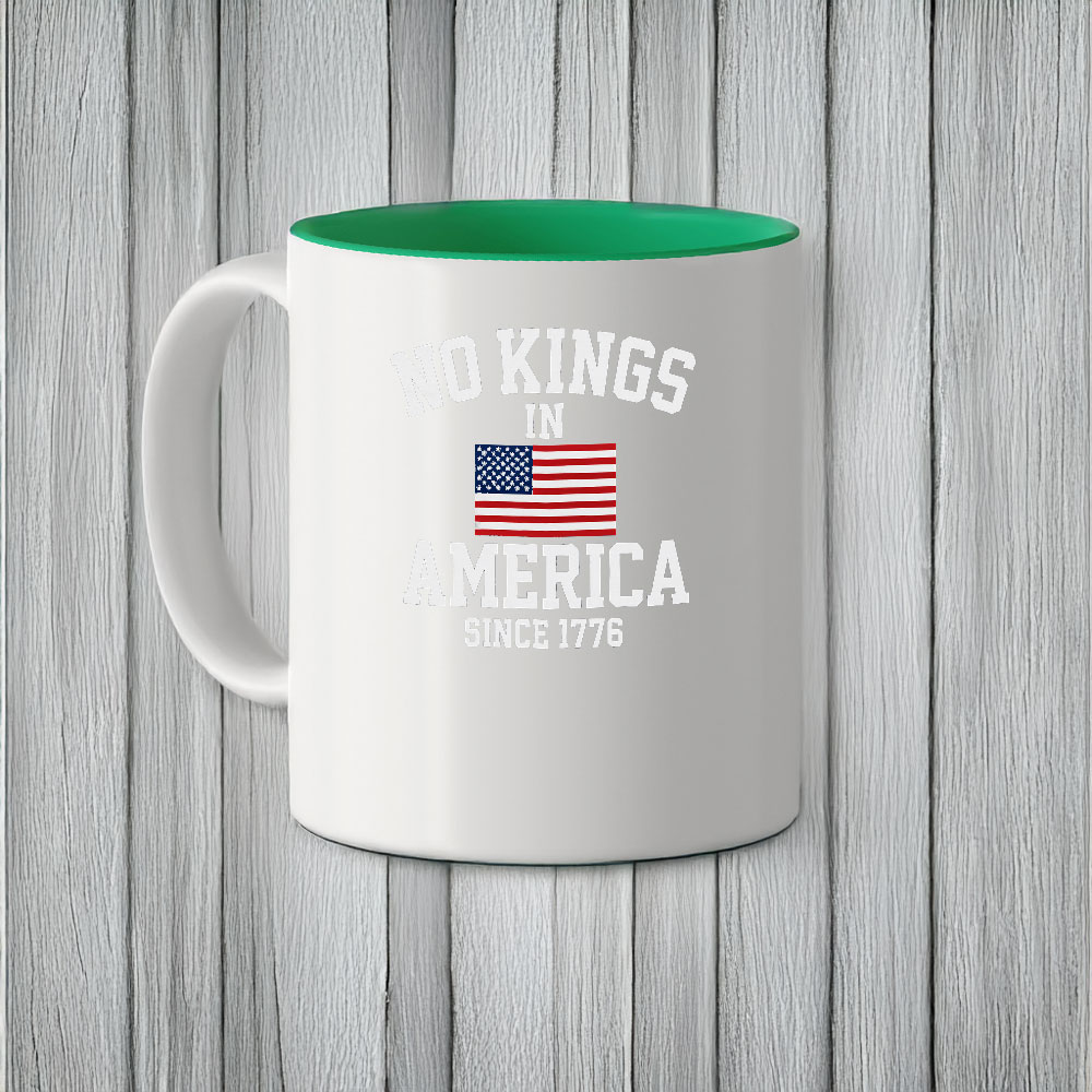 This bold ceramic mug features a powerful statement: “No Kings in America – Since 1776” beneath a classic U.S. flag. A perfect tribute to the founding values of liberty and democracy.