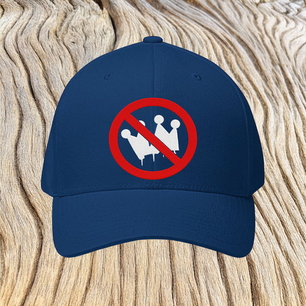 Embroidered “No Kings” crown symbol with bold red prohibition circle. Clean minimalist political protest hat.
